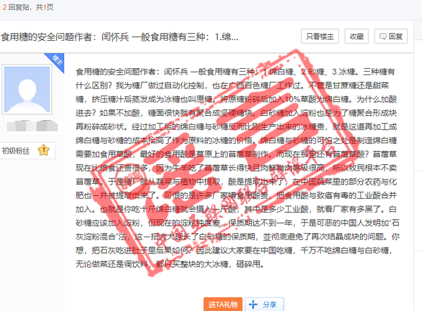 “白砂糖里加入了‘石灰淀粉混合物’,吃白砂糖等于把石灰吃進肚子里。”