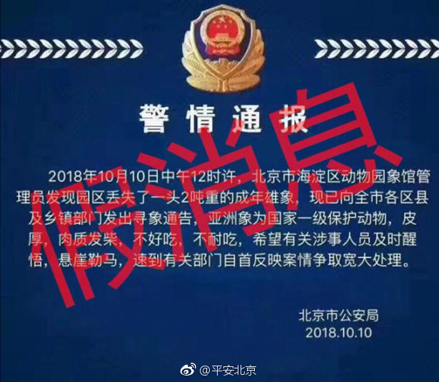 網(wǎng)絡上出現(xiàn)關于“北京海淀區(qū)動物園象館管理員發(fā)現(xiàn)園區(qū)丟失一頭2噸重的成年雄象”的消息,文內稱已向全市各區(qū)縣發(fā)出尋找通告。同時,建議涉事人員自首。該消息引發(fā)網(wǎng)民關注。