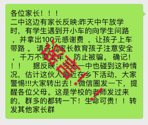 最近,有網友的朋友圈流傳著“二中附近有司機用百元感謝費騙小學生帶路”的消息,21日,北京警方針對該消息發布通報稱,該消息為謠言,在全國許多地方都曾出現過。