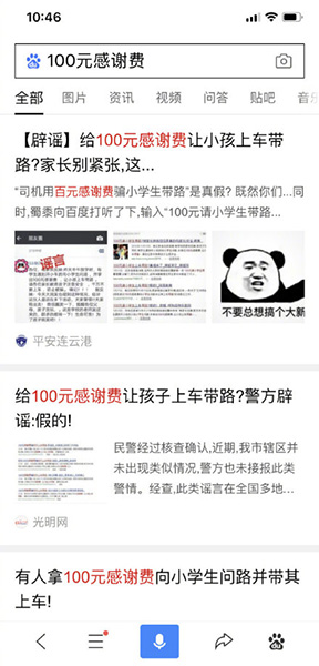 11月21日,北京警方針對網上流傳的“二中附近有司機用百元感謝費騙小學生帶路”消息做出辟謠。圖為網頁搜索截圖。千龍網發