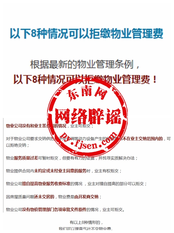 網(wǎng)友張小姐撥打《網(wǎng)絡(luò)辟謠舉報平臺》電話咨詢一篇名為“這8種情況可暫時拒繳物業(yè)費!小區(qū)還得‘倒找錢’!”的文章內(nèi)容是否真實。該文章中稱,根據(jù)最新的物業(yè)管理條例,出現(xiàn)上述八種情況業(yè)主也可以不交物業(yè)費。《網(wǎng)絡(luò)辟謠舉報平臺》記者從相關(guān)部門了解到,這篇文章內(nèi)容不實,《福建省物業(yè)管理條例》中并未有關(guān)于何種情況可拒交物業(yè)費的規(guī)定。