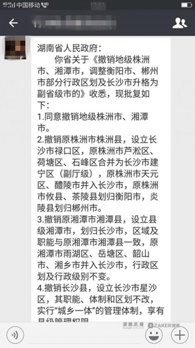 這份落款2018年3月25日的“批復”內容涉及包括撤銷地級株洲市、湘潭市;撤銷原株洲市株洲縣,設立長沙市祿口區,原株洲市蘆淞區、荷塘區、石峰區合并為長沙市建寧區(副廳級),原株洲市天元區、醴陵市并入長沙市,原株洲市攸縣、茶陵縣劃歸衡陽市,炎陵縣劃歸郴州市;撤銷原湘潭市湘潭縣,設立縣級湘潭市,劃歸長沙市,區域及職能與原湘潭市湘潭縣一致,原湘潭市雨湖區、岳塘區、韶山市、湘鄉市并入長沙市,行政區劃及行政級別不變;撤銷長沙縣,設立長沙市星沙區,其職能、體制和區劃不改,實行“城鄉一體”的管理體制,享有縣級管理權限;長沙市開福區、芙蓉區合并為長沙市開福區(副廳局級),長沙市雨花區、天心區合并為長沙市天心區(副廳級);調整后的長沙市升格為副省級市等六條具體劃分調整。