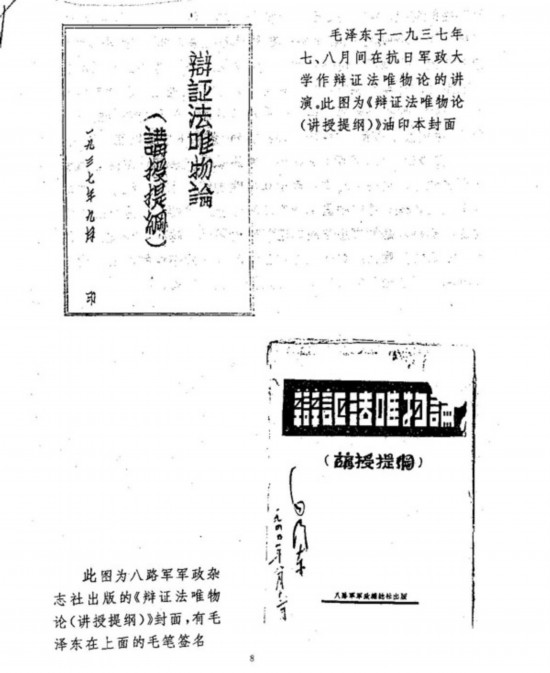 中央檔案館收藏的《辯證法唯物論》講授提綱的油印件和鉛印件,至今保存完好(見正文照片)。《真相》一文卻說《實(shí)踐論》、《矛盾論》不是毛澤東寫的,這不是無稽之談?dòng)质鞘裁矗?/p>