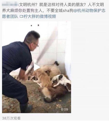 因?yàn)樽约业墓肥芰恕拔保?1月3日,杭州市余杭區(qū)的一名男子對(duì)路人大打出手,引發(fā)了輿論廣泛關(guān)注。11月15日,杭州市城管委開展了文明養(yǎng)犬專項(xiàng)治理行動(dòng)。始料未及的是,一時(shí)之間,“暴力執(zhí)法”“當(dāng)街棒殺”“血染的杭州”等言論在網(wǎng)上傳播甚廣。
