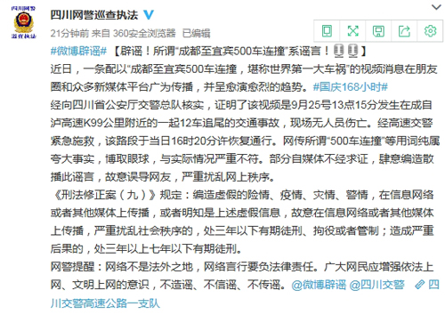 夸大事實博眼球!四川網(wǎng)警:“成都至宜賓500車連撞”系謠言