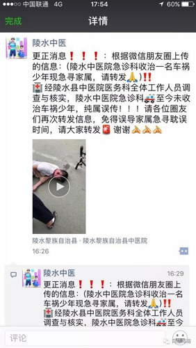 30日下午5時許,記者聯系了陵水中醫院辦公室黃主任,他告訴記者,醫院知道此事后高度重視,迅速對此事進行查證。經調查患者就診信息,并未收治視頻中的受傷少年。朋友圈傳的消息純屬謠言,他們也在官方微信上發布了辟謠聲明。