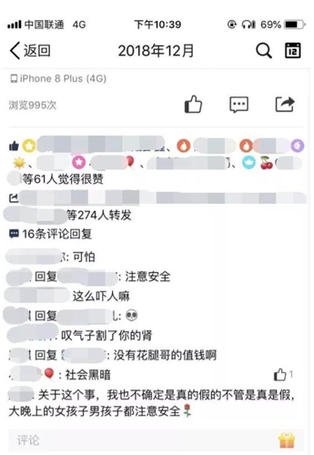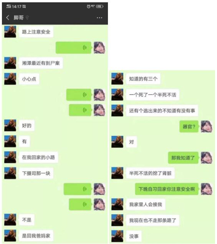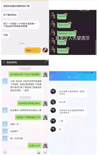 “湘潭市岳塘區(qū)下攝司附近有女生被挖器官”部分網(wǎng)傳謠言截圖。