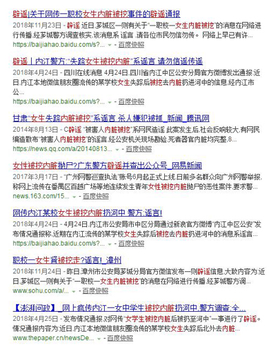 百度搜索出的之前部分網(wǎng)傳謠言和辟謠信息。