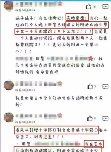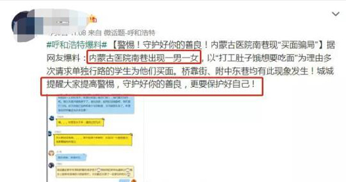 連日來,網絡平臺傳播呼和浩特市醫院、高校、商場等地有人攔截女學生,以帶路、買飯等為由,意圖實施拐騙的信息。