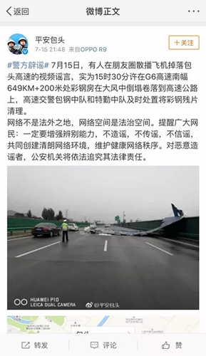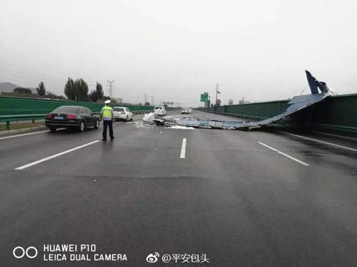 7月15日,有人在朋友圈散播飛機掉落包頭高速的視頻謠言,實為15時30分許在G6高速南幅649KM+200米處彩鋼房在大風中倒塌卷落到高速公路上,高速交警包鋼中隊和特勤中隊及時處置將彩鋼殘片清理。