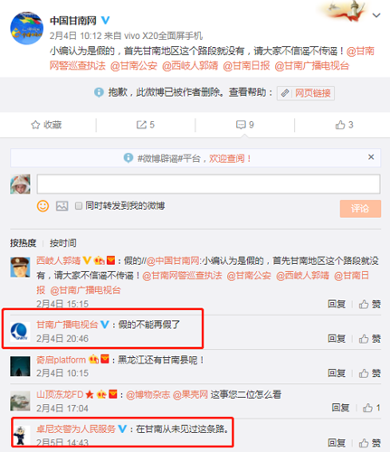2月4日,微博認(rèn)證為甘肅省甘南藏族自治州對外宣傳綜合門戶網(wǎng)站的“@中國甘南網(wǎng)”對此辟謠,甘南當(dāng)?shù)貨]有這個路段,請網(wǎng)友勿信謠勿傳謠。而在這條辟謠微博的評論中,“@甘南廣播電視臺”也表示這段視頻是假的。而“@甘南交警支隊卓尼大隊”則留言“在甘南從未見過這條路”。