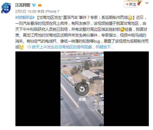 2月5日,“@江蘇網(wǎng)警”對此視頻也發(fā)布辟謠消息:“經(jīng)查,我國甘肅、黑龍江兩地的甘南地區(qū)近期并未發(fā)生類似事件,專家指出,視頻中斑馬線的消失、有如空氣的電線桿、像紙一樣薄的輪胎等bug,暴露了該視頻為后期制作而成?!?/p>