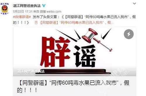 網帖還言之鑿鑿地宣稱“毒水果事件在全國范圍內已影響5.4萬人,造成4人死亡,1.3萬人住院治療……”。記者搜索了公開報道發現,根本沒有網帖中所謂的“毒水果”事件發生,其中列舉的多個數字完全是無中生有。目前,已有多地的網警對此進行辟謠,其中廣東省湛江市警方“@湛江網警巡查執法”5月22日發布文章稱,經過民警調查,“毒水果流入市場”的傳言純屬謠言,其中的配圖也有明顯PS痕跡,網友不要輕信。