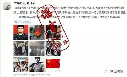 謠言:今年3月,有一熱傳網(wǎng)帖稱:“退伍老兵陳豐”攜妻子到寶島臺灣旅游,見3名日本人在街上當眾焚燒五星紅旗,雙方產(chǎn)生沖突,導(dǎo)致一死二傷。網(wǎng)帖還稱,我國臺灣地區(qū)已經(jīng)有513名警察參與到聯(lián)名中來,并且人數(shù)還在不斷增加,這名老兵雖然沖動,但是為了國家和民族的榮譽,呼吁網(wǎng)友們轉(zhuǎn)發(fā)支持“陳豐”。