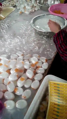 謠言:“人造假雞蛋”制作過(guò)程的小視頻網(wǎng)上瘋傳。兩個(gè)戴著袖套的人不斷從盆中撈出白色膠狀物質(zhì),塞入準(zhǔn)備好的透明模具中,而一旁放置了不少已制作完成的“假雞蛋”。