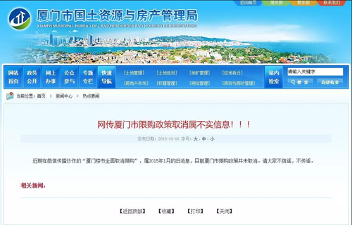針對近期在微信傳播炒作的“廈門樓市全面取消限購”消息,廈門市國土資源與房產管理局16日發布辟謠信息,表示該信息屬2015年1月的舊消息,目前廈門市限購政策并未取消。