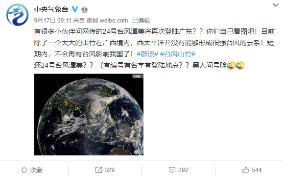 近期,伴隨“山竹”臺風過境,“‘潭美’襲粵”的信息也在網上大肆流傳,稱“第24號臺風‘潭美’,預計9月21日強勢登陸我國”引發網友恐慌。據中央氣象臺官方微博消息,目前除了一個大大的山竹在廣西境內,西太平洋并沒有能夠形成很強臺風的云系!短期內,不會再有臺風影響我國了!