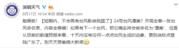 深圳市氣象局官方微博對此也回應:敲黑板!如果有下一個臺風,那它確實將會被命名為“潭美”,但是從目前的數值預報來看,十天內沒有任何一點點臺風生成的跡象,更別說欽點登陸廣東了。