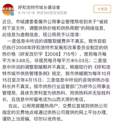 內(nèi)蒙古自治區(qū)呼和浩特市城鄉(xiāng)建設(shè)委員會官方微博辟謠: