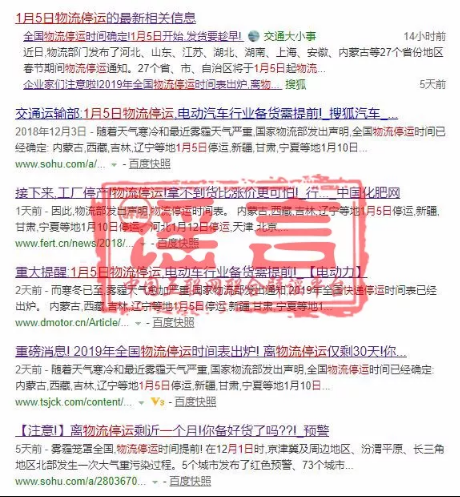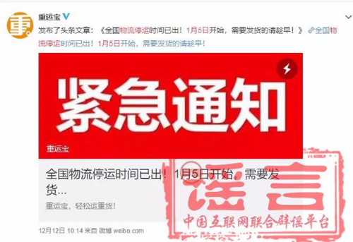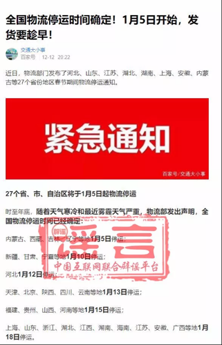 近日,網上出現了“1月5日物流停運”等相關傳言,中國互聯網聯合辟謠平臺向交通運輸部求證,此為謠言!