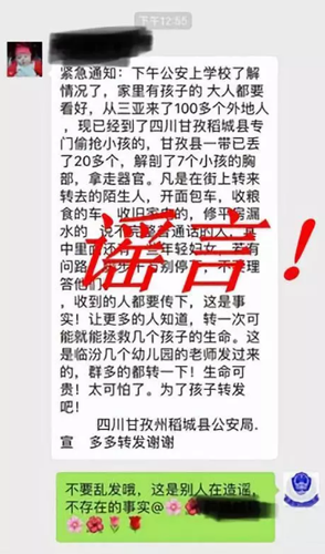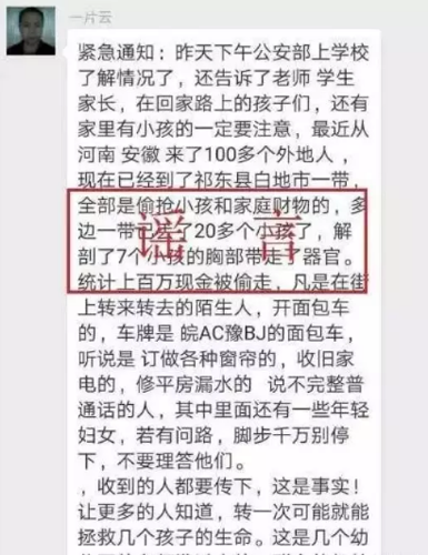 在聯(lián)合辟謠平臺(tái)的辟謠數(shù)據(jù)庫(kù)中,有這樣一條出現(xiàn)頻率極高的謠言:“從XX(地名)來(lái)了100外地人專門(mén)偷搶小孩,XX(地名)已丟失20多個(gè)小孩,解剖了7個(gè)小孩并拿走器官………”
