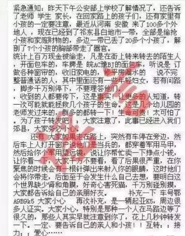 請(qǐng)所有家長(zhǎng)注意了,挨千刀的狼又來(lái)了,昨天在XX(地名)被偷了三個(gè)孩子,XX(地名)也丟了兩個(gè)孩子~有一個(gè)陌生人剛把孩子迷暈,幸好被人及時(shí)發(fā)現(xiàn),偷孩子的兩個(gè)人被抓了起來(lái),現(xiàn)關(guān)在XX(地名)派出所。根據(jù)他們交代,這一次他們這個(gè)團(tuán)伙派了一百多人,專偷七歲以上的孩子,可能是要人體器官,比如腎臟什么的。前天XX(地名)偷了5個(gè)孩子,最小4歲,最大12歲,現(xiàn)已全城戒嚴(yán)。