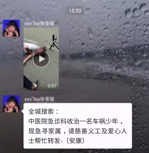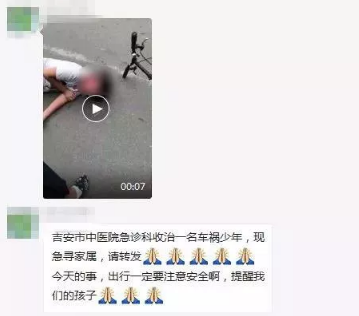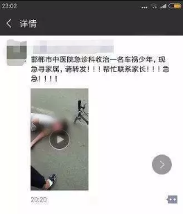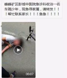近日,多地微信群、朋友圈都在轉(zhuǎn)發(fā)一段視頻,網(wǎng)傳視頻僅6秒,視頻中一名男孩倒地,面部流血。并配文稱“XX市中醫(yī)院急診科收治一名車(chē)禍少年,現(xiàn)急尋家屬……”