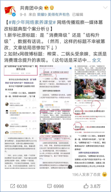 2018年9月8日,新華社發布《是“消費降級”還是“結構升級”?數據有話說》一文。財經網轉載時將標題篡改為《新華社:榨菜、二鍋頭受親睞,實質是消費理念提升的表現》,隨后被大量網站、新媒體轉發,引發網民群嘲,造成嚴重不良影響。經查,這句話是采訪中某專家的表述,且有前后文及語境,并非新華社觀點,作為標題,更需商榷。且原文中提到,中國零售消費總額提升、旅游消費和電影票房數據提升,佐證了“消費結構提升”的觀點。