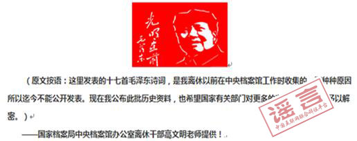 新聞發言人:這是過去數年間曾多次被惡意翻炒的文章,更換了很多個標題。此文打著“解密”檔案的旗號,作者被包裝為中央檔案館“老干部高文明”,并宣稱帖子中“公布”的17首詩詞是他“在中央檔案館工作時收集的”。經中央檔案館查核,此帖標注的作者“老干部高文明”查無此人。中央檔案館、國家檔案局所屬事業單位有一名在職干部與“高文明”同名,但其本人從未在檔案保管部門工作過,也對此文完全不知情。同時,經認真核查中央檔案館館藏的毛澤東詩詞檔案,沒有此帖中提及的所謂17首毛澤東詩詞。這些詩詞全部是偽作。