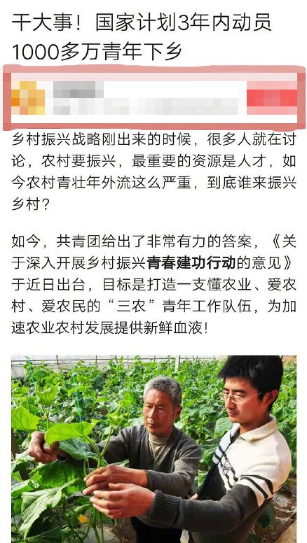 近日,共青團(tuán)中央印發(fā)《關(guān)于深入開展鄉(xiāng)村振興青春建功行動(dòng)的意見》。本是一件落實(shí)國家部署的好事,卻被諸如“干大事!國家計(jì)劃3年內(nèi)動(dòng)員1000多萬青年下鄉(xiāng)”的夸張標(biāo)題,引起了一些人不必要的猜測(cè)。