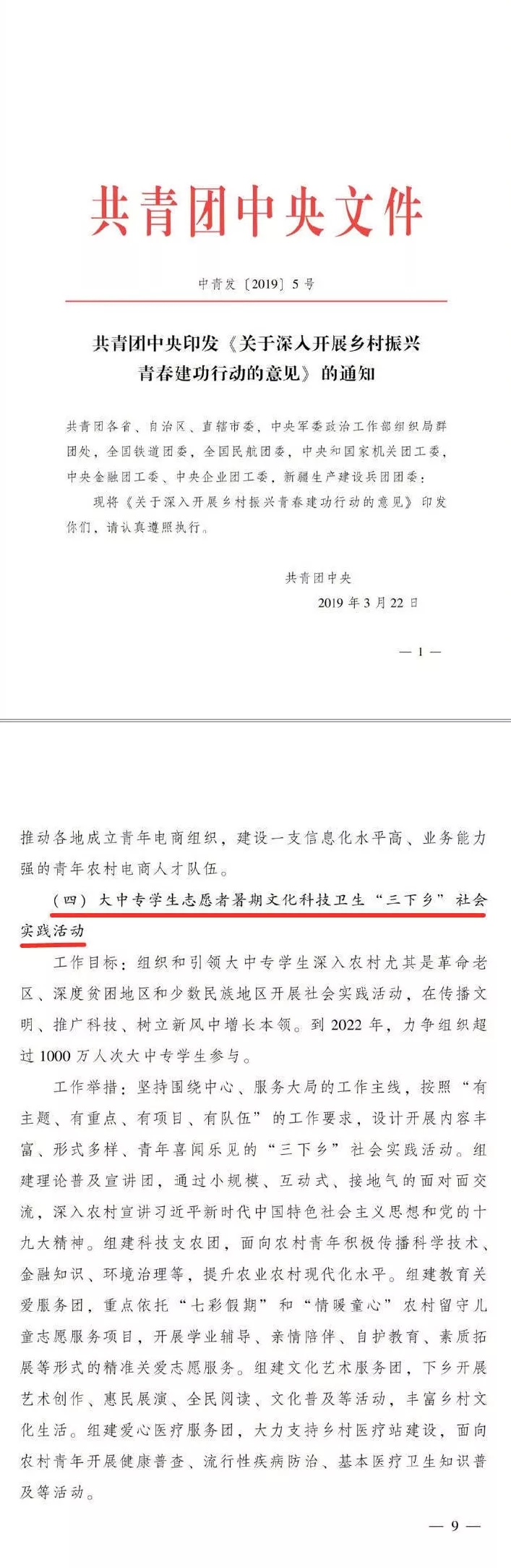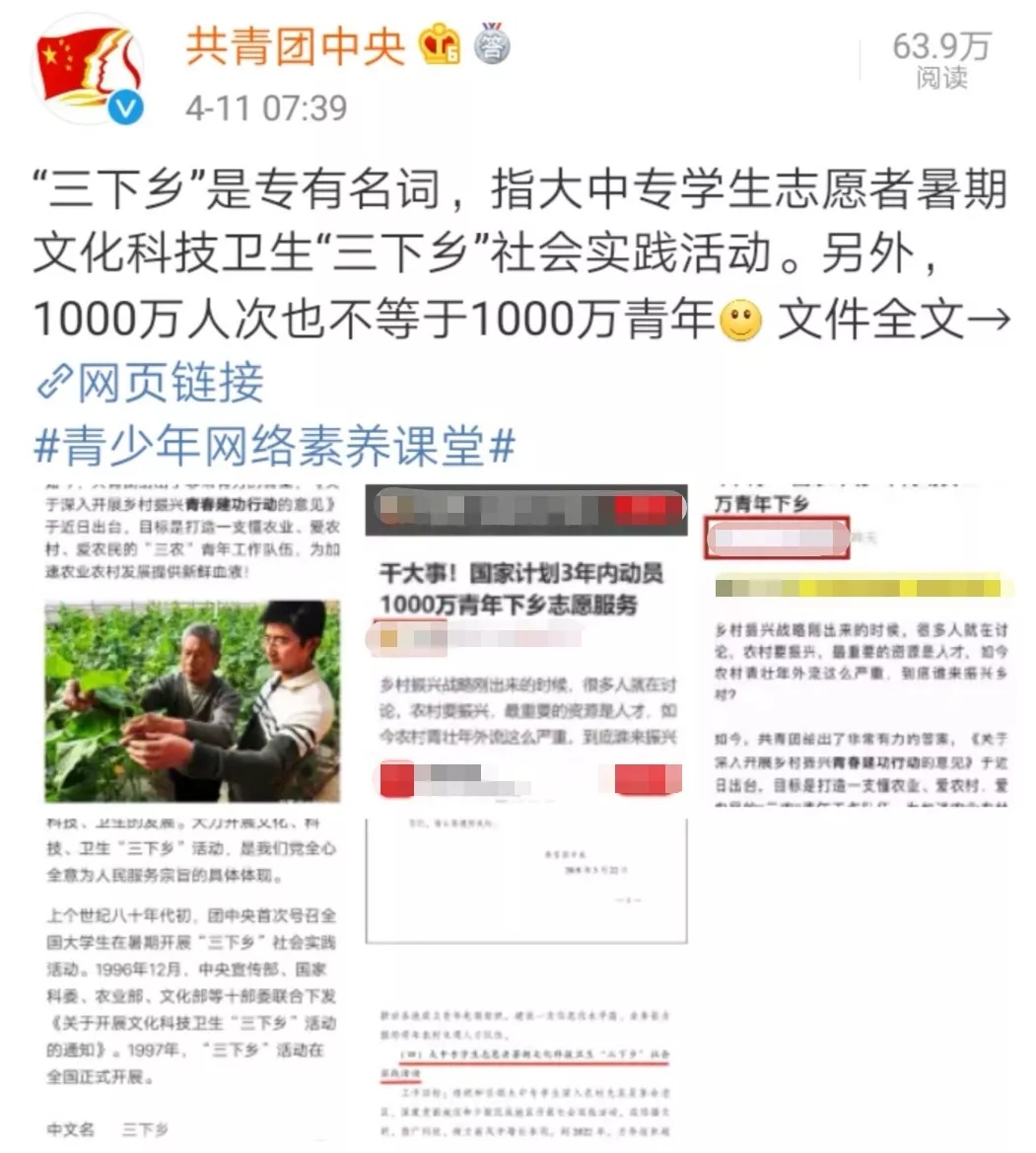 可是翻開文件原文,講的不過是“到2022年,力爭組織超過1000萬人次大中專學(xué)生,參與大中專學(xué)生志愿者暑期文化科技衛(wèi)生‘三下鄉(xiāng)’社會(huì)實(shí)踐活動(dòng)”。
