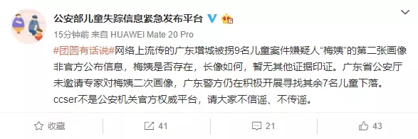網絡上流傳的廣東增城被拐9名兒童案件嫌疑人“梅姨”的第二張畫像非官方公布信息,“梅姨”是否存在、長相如何,暫無其他證據印證。廣東省公安廳未邀請專家對“梅姨”二次畫像,廣東警方仍在積極尋找其余7名兒童下落。ccser不是公安機關官方權威平臺,請大家不信謠、不傳謠。(辟謠平臺公眾號)
