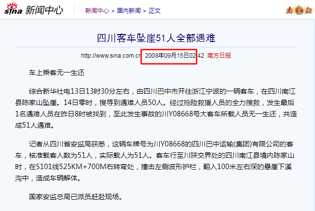 據(jù)媒體報(bào)道,2008年9月13日13時(shí)30分左右,由四川巴中市開往浙江寧波的一輛客車,在四川南江縣陳家山墜崖。2008年9月14日零時(shí),搜尋到遇難人員50人。經(jīng)過(guò)搶險(xiǎn)救援人員的全力搜救,最后1名遇難人員后被找到,至此發(fā)生事故的川y08668號(hào)大客車所載人員無(wú)一生還,共造成51人遇難。這輛車牌號(hào)為川y08668的四川巴中運(yùn)輸(集團(tuán))有限公司的客車,核準(zhǔn)載客人數(shù)為51人,實(shí)際載人為51人。客車行至川陜交界處的四川南江縣境內(nèi)陳家山時(shí),在s101線525km+700m右轉(zhuǎn)彎處,撞擊左側(cè)波形護(hù)欄,翻入100米左右深的懸崖下溪溝中,造成車輛解體。