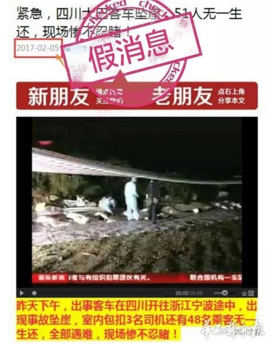 2017年2月,當(dāng)時(shí)這條“新聞”在朋友圈瘋傳,稱一輛從四川開往寧波的大巴車在當(dāng)年2月4日墜崖51人遇難。這條“新聞”有圖有視頻,網(wǎng)友們紛紛轉(zhuǎn)發(fā),文章閱讀量瞬間達(dá)“10萬(wàn)+”,甚至有些視頻的點(diǎn)擊量已超過(guò)千萬(wàn)。2017年2月8日,四川省公安廳交警總隊(duì)對(duì)此進(jìn)行辟謠:此事故是在2008年發(fā)生的,請(qǐng)大家不要被標(biāo)題黨嚇壞了。