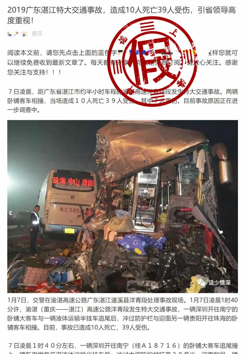 記者注意到,為博眼球騙流量,曾有多起事故被某些自媒體賬號(hào)改頭換面、掐頭去尾進(jìn)行翻炒。比如在今年9月,網(wǎng)上曾出現(xiàn)一批題為《2019xx地特大交通事故,造成x人死亡(受傷),引省(市)領(lǐng)導(dǎo)高度重視!》的文章。這些文章中提到的“重大交通事故”發(fā)生地涉及到四川、廣東湛江、山東棗莊等地。解放日?qǐng)?bào)·上觀新聞?dòng)浾邔?duì)此進(jìn)行查證發(fā)現(xiàn),這類文章其實(shí)都是謠言。是有人將多年前的事故翻出來(lái),并改個(gè)時(shí)間、起個(gè)聳人聽聞的標(biāo)題。其中,一條所謂“2019廣東湛江特大交通事故”發(fā)生在2008年,距今已11年。上海辟謠平臺(tái)提醒:交通安全警鐘要長(zhǎng)鳴,但對(duì)這類胡編亂造的虛假信息,一定要堅(jiān)決予以曝光。(作者:宋慧 本文由鄭子愚協(xié)助校對(duì))