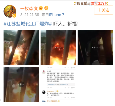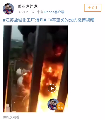 21日晚,有網友在網上發布有關鹽城爆炸的消息,并配發相關圖片。另有網友發布一則視頻,視頻中一座化工設備突然發生爆炸,火光沖天,升起滾滾濃煙。