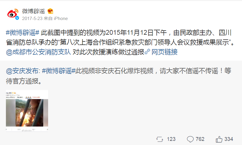 但經仔細觀察對比,上述網傳圖片和視頻并非來自鹽城爆炸事故。上述視頻曾在2017年安徽安慶石化爆炸事故時流傳過,當時@微博辟謠就曾辟謠過。