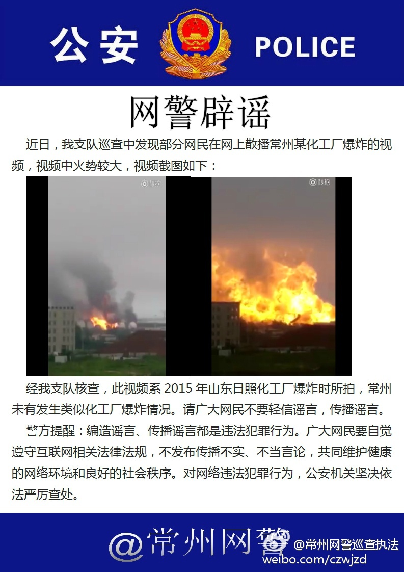 但這條視頻同樣不是來自鹽城爆炸事故。據@常州網警巡查執法 2017年2月通報,上述視頻是2015年山東日照的化工廠爆炸時所拍。