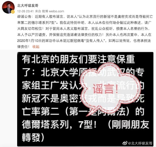对此,北京大学第一医院呼吸内科主任王广发实名认证微博“北大呼吸发哥”12月26日发布辟谣公告:近期有人散布谣言,说本人“认为北京流行的新冠不是奥密克戎而是导致死亡率第二的德尔塔系列7型”。我在此特别申明,本人从未在任何场合做过此种表述,请广大网友切勿相信!对于冒用本人名义散布谣言,扰乱公众视听,损害本人名誉的行为,本人予以严厉谴责,并保留追究造谣者法律责任的权力!另外本人也再次重申,本人在2020年1月10日的采访中从未说过新冠病毒“没有人传人”,如再以讹传讹,也将承担法律责任!
