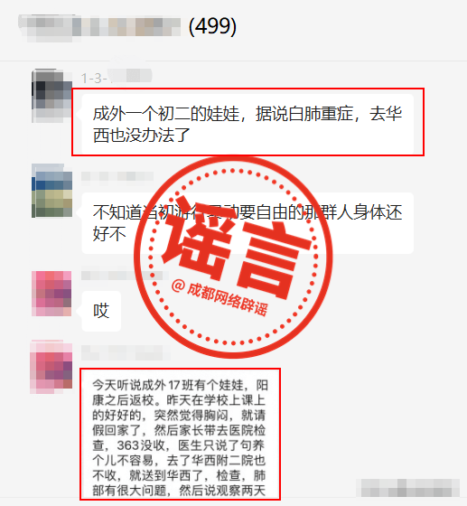 近日,成都本地部分微信群内流传一则“成外某学生因感染新冠病毒去世”相关消息,内容称“成外一个初二的娃娃,据说白肺重症,去华西也没办法了”,该消息引发一些家长和学生群体的恐慌和担忧。
