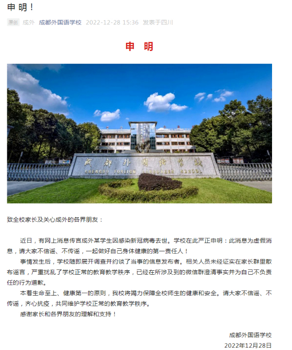 针对网传消息,12月28日下午15时许,成都外国语学校通过官微发布申明,全文如下: