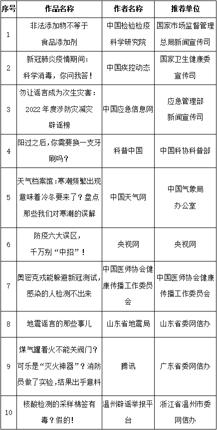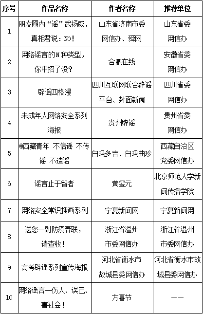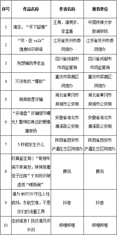第五届中国互联网辟谣优秀作品分为网络辟谣版块和公益宣传版块,分别设置“组织策划”“社会民生”“科普知识”“短视频”“平面设计”“歌曲”6个类别,每类各10部作品。本届活动受到社会各界积极支持,共收到800多家政府部门、协会、机构、院校和个人报送的1628部作品,历经初审评分、公众投票、复审评议三个环节,最终评选出60部优秀作品。获奖作品涵盖经济民生、社会热点、科普知识等多个主题,聚焦社会关注、群众关切,以权威事实、科学思想、鲜活形式有力辟除谣言、传递真知,展现出强烈的社会责任意识和鲜明的网络传播特色,有助于提升公众识谣辨谣能力,营造良好网络生态。