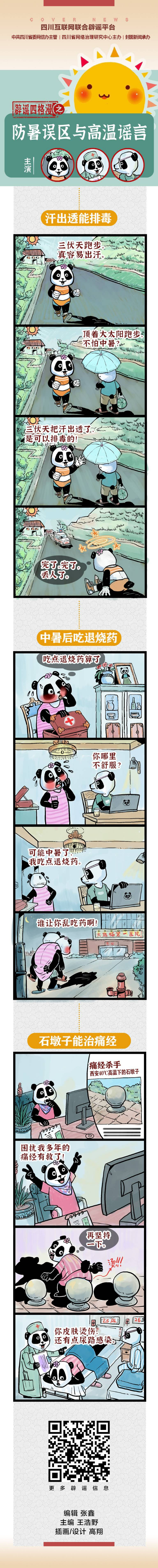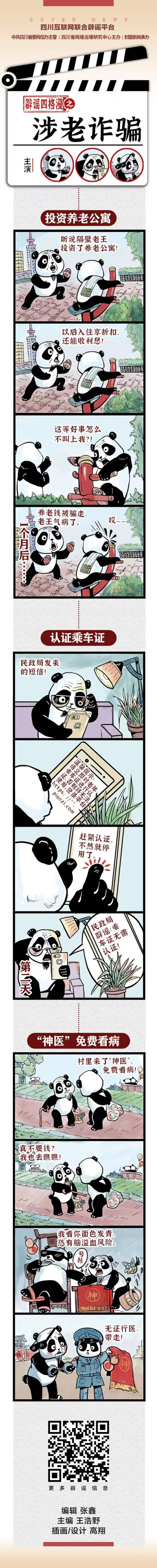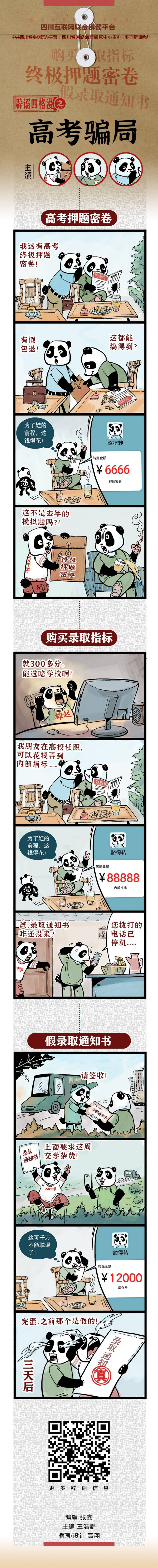 作品简介:专栏内容为纯手工原创漫画作,以四川广为人知且亲和度高的熊猫作为形象载体,每一期都用一个独特熊猫形象作为主角,同时以短小精悍的故事作为叙事手段,通过主角熊猫的经历告诉大家,要警惕骗局,拒绝诱惑,识别谣言。相关专栏内容将高温防暑谣言、高考骗局、涉老诈骗等内容以鲜明易懂的漫画形式进行呈现。