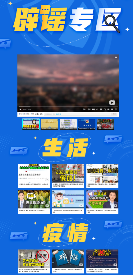 作品简介:《B站辟谣专区》是商业网站创新辟谣服务产品的典型尝试。该专区将涉网民生活、疫情、重要社会事件的辟谣信息分版块展示,并同步打上谣言标签,驳斥假借权威、移花接木、捕风捉影等造谣套路,维护良好站内生态。