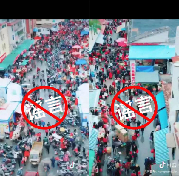 综合上述信息可以发现,该视频系2022年1月31日福建省莆田市除夕之日的赶集视频,而非所谓贵阳市云岩区草黄路“没饭吃的人在闹事”,相关谣言视频为对外地视频画面进行配音加工后形成的虚假信息。