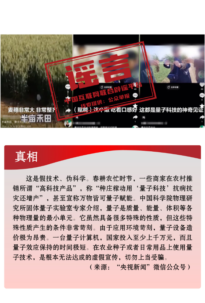 利用科技概念制造噱头,误导公众认知。4月,涉及天文、文物、健康、环保、农业、教育等诸多领域的假科技、伪科学信息流传于网上,造谣传谣者利用人们对新技术的好奇和向往心理,或夸大其词、或扭曲事实、或利用AI凭空编造,企图蒙蔽群众、牟取私利。比如,“中国‘天眼’变成垃圾场”纯属张冠李戴,“三星堆挖出酷似‘飞碟’青铜器”完全由AI合成,“福州福飞北路核辐射超标”则更是博取眼球的恶意炒作,扰乱广大群众的正确认知与理性判断。还有一些商家为带货牟利,利用伪科学炒概念,宣称“量子赋能农作物,抗病抗灾还增产”“‘体考神器’喝一口就能及格”,损害公众利益,社会影响恶劣。此外,在食品健康领域,诸如“食用蜂蜜或花粉防过敏”“鸡蛋煮老后有层‘黑膜’,吃了会致癌”等说法流传,让人将信将疑,实则都是不符合科学、不利于健康的说法。