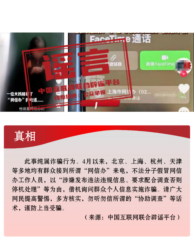 冒用官方名义造假行骗,损害群众利益。4月以来,一些不法分子冒用国家机关名义、假扮相关工作人员,编造诈骗“话术剧本”,企图行骗牟利。如全国多地有群众接到所谓“网信办”来电,不法分子假冒网信办工作人员,以“群众手机涉嫌违法违规、要求配合调查否则停机处理”等为由,借机询问群众个人信息实施诈骗。另有网传民政部养老服务司开展“颐养家园建设”“个人普惠养老金方案”等所谓“官方行为”,实际上均系不法分子实施的违法诈骗行为;“养老保险断缴3个月待遇清零”“单次住院不超过15天”等假消息以讹传讹,歪解国家医保政策,损害群众合法权益。
