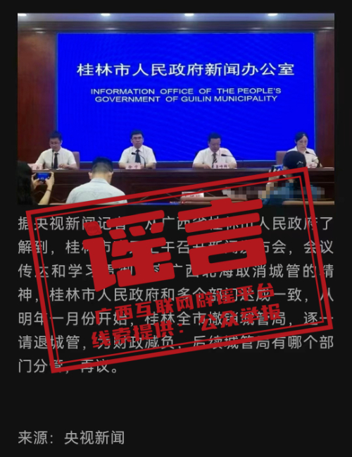 经核实,网传信息不属实。桂林市城市管理委员会发布信息称,该假新闻冒用央视新闻名义,盗用2021年8月10日桂林市2021年上半年经济运行情况新闻发布会的新闻图片,编造“桂林全市撤销城管局”等谣言信息。桂林市城市管理委员会对捏造虚假信息,造谣生事的现象,也将依法进行维权。