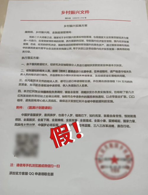 骗子利用乡村振兴的热点话题和国家政策,伪造“红头文件”邮寄给受害人,诱骗受害人扫码入群。骗子在群里发布虚假的补贴信息,诱导受害人下载虚假App完成账户认证并缴纳激活费实施诈骗。