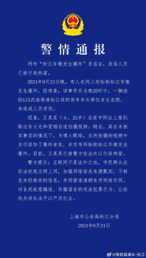 9月24日晚,上海市公安局松江分局发布警情通报:网传“松江车墩发生爆炸”系谣言,造谣人员已被行政拘留。